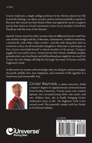 Gracie Anderson, a single college professor in her thirties, knows her life is severely lacking—no dates, no pets, and no real personal life to speak of. But now she’s stuck: her best friend, Chloe, has signed her up for a support group that meets at a local community center in an attempt to hook her friend up with the man of her dreams. Instead, Gracie meets five other women who are different from her and from one another as night and day. A librarian, a dominatrix, a fashion consultant, a housewife, and a blue-collar worker—and the only thing they have in common is they are all motherless daughters. Reluctant to participate at first, Gracie soon finds herself a critical member of the group. Trying to juggle her successful career, overprotective best friend, snobbish socialite grandmother, new boyfriend, and old boyfriend just might be too much for Gracie, but two things will help her through: her sense of humor and the Highmore Circle. In this novel, six women with seemingly only one thing in common navigate the perils, pitfalls, love, loss, happiness, and craziness of life together in a humorous and memorable way.
