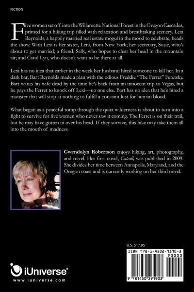 Five women set off into the Willamette National Forest in the Oregon Cascades, primed for a hiking trip filled with relaxation and breathtaking scenery. Lexi Reynolds, a happily married real estate mogul in the mood to celebrate, heads the show. With Lexi is her sister, Leni, from New York; her secretary, Susie, who's about to get married; a friend, Sally, who hopes to clear her head in the mountain air; and Carol Lyn, who doesn't want to be there at all. Lexi has no idea that earlier in the week her husband hired someone to kill her. In a dark bar, Bart Reynolds made a plan with the odious Freddie "The Ferret" Feretsky. Bart wants his wife dead by the time he's back from an innocent trip to Vegas, but he pays the Ferret to knock off Lexi-no one else. Bart has no idea that he's hired a monster that will stop at nothing to fulfill a constant lust for human blood. What began as a peaceful romp through the quiet wilderness is about to turn into a fight to survive for five women who never saw it coming. The Ferret is on their trail, but he may have gotten in over his head. If they survive, this hike may take them all into the mouth of madness.