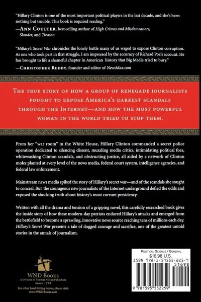 The true story of how a group of renegade journalists fought to expose America's darkest scandals through the Internet?and how the most powerful woman in the world tried to stop them. From her "war room" in the White House, Hillary Clinton commanded a secret police operation dedicated to silencing dissent, muzzling media critics, intimidating political foes, whitewashing Clinton scandals, and obstructing justice, all aided by a network of Clinton moles planted at every level of the news media, federal court system, intelligence agencies, and federal law enforcement. Mainstream news media spiked the story of Hillary's secret war?and of the scandals she sought to conceal. But the courageous new journalists of the Internet underground defied the odds and exposed the shocking truth about history's most corrupt presidency. Written with all the drama and tension of a gripping novel, this carefully researched book gives the inside story of how these modern-day patriots endured Hillary's attacks and emerged from the battlefield to become a sprawling, innovative news source reaching tens of millions each day. Hillary's Secret War presents a tale of dogged courage and sacrifice, one of the greatest untold stories in the annals of journalism. "Hillary Clinton is one of the most important political players in the last decade, and she's been nothing but trouble. This book is required reading." ?Ann Coulter, best-selling author of High Crimes and Misdemeanors, Slander, and Treason "Hillary's Secret War chronicles the lonely battle many of us waged to expose Clinton corruption. As one who took part in that struggle, I am impressed by the accuracy of Richard Poe's account. He has brought to life a shameful chapter in American history that Big Media tried to bury." ?Christopher Ruddy, founder and editor of NewsMax.com