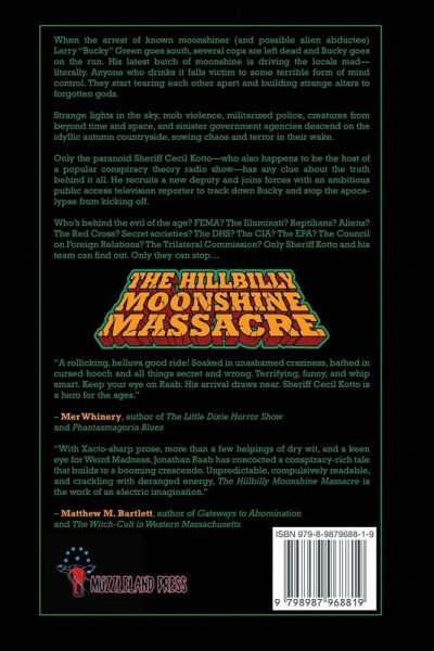 When the arrest of known moonshiner (and possible alien abductee) Larry "Bucky" Green goes south, several cops are left dead and Bucky goes on the run. His latest batch of moonshine is driving the locals mad-literally. Anyone who drinks it falls victim to some terrible form of mind control. They start tearing each other apart and building strange altars to forgotten gods. Strange lights in the sky, mob violence, militarized police, creatures from beyond time and space, and sinister government agencies descend on the idyllic autumn countryside, sowing chaos and terror in their wake. Only the paranoid Sheriff Cecil Kotto-who also happens to be the host of a popular conspiracy theory radio show-has any clue about the truth behind it all. He recruits a new deputy and joins forces with an ambitious public access television reporter to track down Bucky and stop the apocalypse from kicking off. Who's behind the evil of the age? FEMA? The Illuminati? Reptilians? Aliens? The Red Cross? Secret societies? The DHS? The CIA? The EPA? The Council on Foreign Relations? The Trilateral Commission? Only Sheriff Kotto and his team can find out. Only they can stop... The Hillbilly Moonshine Massacre "A rollicking, helluva good ride! Soaked in unashamed craziness, bathed in cursed hooch and all things secret and wrong. Terrifying, funny, and whip smart. Keep your eye on Raab. His arrival draws near. Sheriff Cecil Kotto is a hero for the ages."- Mer Whinery, author of The Little Dixie Horror Show and Phantasmagoria Blues "With Xacto-sharp prose, more than a few helpings of dry wit, and a keen eye for Weird Madness, Jonathan Raab has concocted a conspiracy-rich tale that builds to a booming crescendo. Unpredictable, compulsively readable, and crackling with deranged energy, The Hillbilly Moonshine Massacre is the work of an electric imagination." - Matthew M. Bartlett, author of Gateways to Abomination and The Witch-Cult in Western Massachusetts