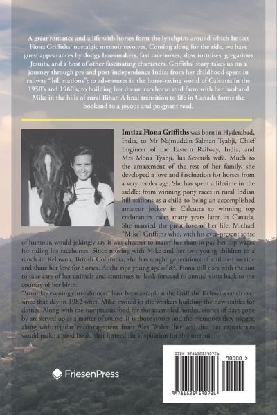 Imtiaz Fiona Griffiths was born in Hyderabad, India, to Mr Najmuddin Salman Tyabji, Chief Engineer of the Eastern Railway, India, and Mrs Mona Tyabji, his Scottish wife. Much to the amazement of the rest of her family, she developed a love and fascination for horses from a very tender age. She has spent a lifetime in the saddle: from winning pony races in rural Indian hill stations as a child to being an accomplished amateur jockey in Calcutta to winning top endurances races many years later in Canada. She married the great love of her life, Michael "Mike" Griffiths who, with his ever-present sense of humour, would jokingly say it was cheaper to marry her than to pay her top wages for riding his racehorses. Since moving with Mike and her two young children to a ranch in Kelowna, British Columbia, she has taught generations of children to ride and share her love for horses. At the ripe young age of 83, Fiona still rises with the sun to take care of her animals and continues to look forward to annual visits back to the country of her birth. "Saturday evening curry dinners" have been a staple at the Griffiths' Kelowna ranch ever since that day in 1982 when Mike invited in the workers building the new stables for dinner. Along with the sumptuous food for the assembled hordes, stories of days gone by are served up as a matter of course. It is those stories and the memories they trigger, along with regular encouragement from Alex Wales (her vet) that her experiences would make a good book, that formed the inspiration for this memoir.