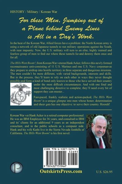 The Hills Went Boom! Join with the United States Marine Corps newly formed Reconnaissance Battalion. The year is 1952 and twelve enlisted men; eleven Marines and one US Navy Corpsman have completed their yearlong Reconnaissance, Demolition and Survival training. The twelve are known as "Recon Unit One" and their mission is to conduct clandestine and highly classified raids on tunnels and caves in the Chinese Communist controlled mountains of North Korea. The missions are complex and filled with danger from many sources. Operating well North of the UN mandated DMZ, in enemy territory; these twelve have been sent to destroy the caves and tunnels of North Korea, most of them built during the Japanese occupation. The Unit must parachute into zones occupied by enemy forces, secure the area, reconnoiter the caves and tunnels then destroy them and "get out" using methods here-to-for unused for these purposes. The reader will identify with some or all of the men who make up this elite force. They come from all walks of life, in post World War II America, and have the same frailties and strengths most of us share. As with all things military there are moments of humor, as well as those moments of danger. Those moments that rekindles our memory and touches our hearts, minds and souls. -Hank Acker