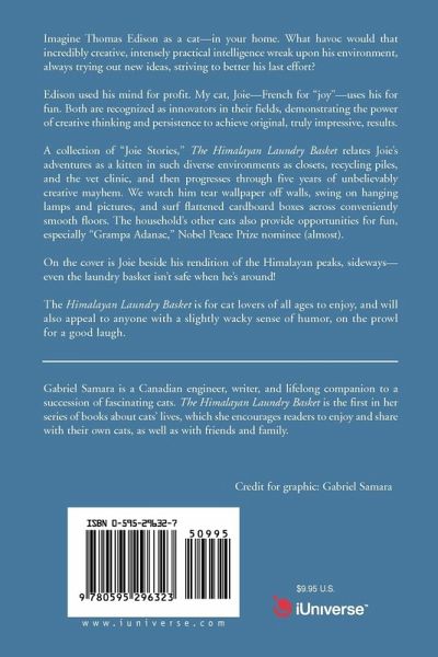 Imagine Thomas Edison as a cat--in your home. What havoc would that incredibly creative, intensely practical intelligence wreak upon his environment, always trying out new ideas, striving to better his last effort? Edison used his mind for profit. My cat, Joie--French for "joy"--uses his for fun. Both are recognized as innovators in their fields, demonstrating the power of creative thinking and persistence to achieve original, truly impressive, results. A collection of "Joie Stories," The Himalayan Laundry Basket relates Joie's adventures as a kitten in such diverse environments as closets, recycling piles, and the vet clinic, and then progresses through five years of unbelievably creative mayhem. We watch him tear wallpaper off walls, swing on hanging lamps and pictures, and surf flattened cardboard boxes across conveniently smooth floors. The household's other cats also provide opportunities for fun, especially "Grampa Adanac," Nobel Peace Prize nominee (almost). On the cover is Joie beside his rendition of the Himalayan peaks, sideways--even the laundry basket isn't safe when he's around! The Himalayan Laundry Basket is for cat lovers of all ages to enjoy, and will also appeal to anyone with a slightly wacky sense of humor, on the prowl for a good laugh.