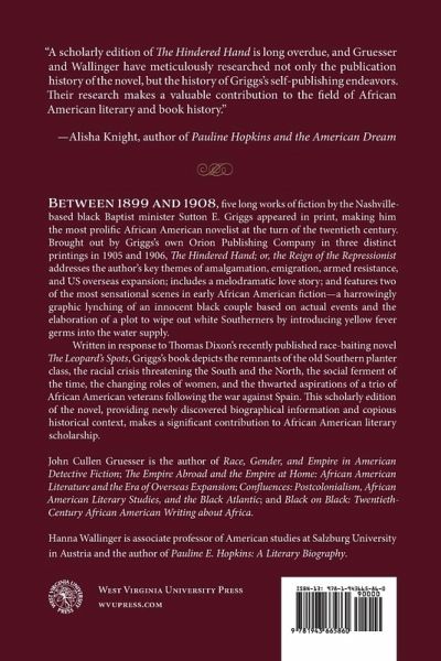 Between 1899 and 1908, five long works of fiction by the Nashville-based black Baptist minister Sutton E. Griggs appeared in print, making him the most prolific African American novelist at the turn of the twentieth century. Brought out by Griggs's own Orion Publishing Company in three distinct printings in 1905 and 1906, The Hindered Hand; or, the Reign of the Repressionist addresses the author's key themes of amalgamation, emigration, armed resistance, and US overseas expansion; includes a melodramatic love story; and features two of the most sensational scenes in early African American fiction--a harrowingly graphic lynching of an innocent black couple based on actual events and the elaboration of a plot to wipe out white Southerners by introducing yellow fever germs into the water supply. Written in response to Thomas Dixon's recently published race-baiting novel The Leopard's Spots, Griggs's book depicts the remnants of the old Southern planter class, the racial crisis threatening the South and the North, the social ferment of the time, the changing roles of women, and the thwarted aspirations of a trio of African American veterans following the war against Spain. This scholarly edition of the novel, providing newly discovered biographical information and copious historical context, makes a significant contribution to African American literary scholarship.