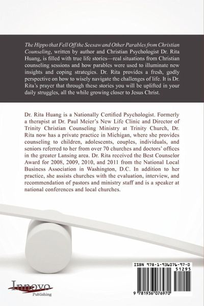 ABOUT THE BOOK: The Hippo that Fell Off the Seesaw and Other Parables from Christian Counseling, written by author and Christian counselor Dr. Rita Huang, is filled with true life stories-real situations from Christian counseling sessions and how parables were used to illuminate new insights and coping strategies. Dr. Rita provides a fresh, godly perspective on how to wisely navigate the challenges of life. It is Dr. Rita's prayer that through these stories you will be uplifted in your daily struggles, all the while growing closer to Jesus Christ. **** ABOUT THE AUTHOR: Dr. Rita Huang is a Nationally Certified Psychologist. Formerly a therapist at Dr. Paul Meier's New Life Clinic and Director of Trinity Christian Counseling Ministry at Trinity Church, Dr. Rita now has a private practice in Michigan, where she provides counseling to children, adolescents, couples, individuals, and seniors referred to her from over 70 churches and doctors' offices in the greater Lansing area. Dr. Rita received the Best Counselor Award for 2008, 2009, 2010, and 2011 from the National Local Business Association in Washington, D.C. In addition to her practice, she assists churches with the evaluation, interview, and recommendation of pastors and ministry staff and is a speaker at national conferences and local churches.