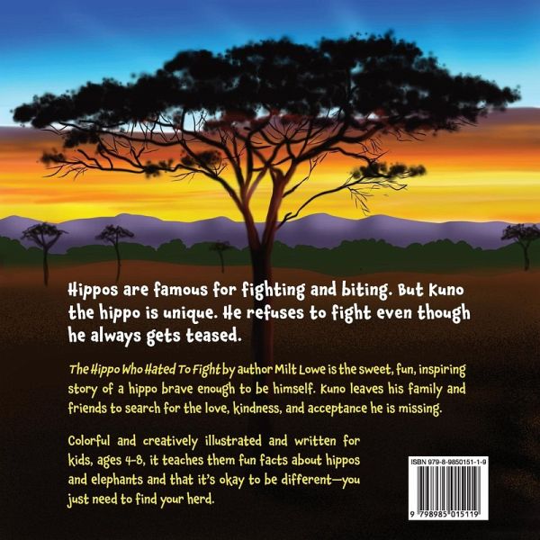 Hippos are famous for fighting and biting. But Kuno the hippo is unique. He refuses to fight even though he always gets teased. "The Hippo Who Hated To Fight" is the sweet, fun, inspiring story of a hippo brave enough to be himself. Kuno leaves his family and friends to search for the love, kindness, and acceptance he is missing. Colorful and creatively illustrated and written for kids ages 4-9, it teaches them fun facts about hippos and elephants and that it's cool to be different-you just need to find your herd.