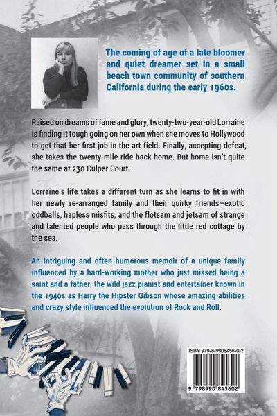 The coming of age of a late bloomer and quiet dreamer set in a small beach town community of southern California during the early 1960s. Born into a musical family and raised on dreams of fame and glory, twenty-two-year-old Lorraine is finding it tough going on her own when she moves to Hollywood in the early 1960s. Her Associate of Art's degree from the local junior college does not help her get a job in the art field. And if that isn't enough, her longtime boyfriend has broken up with her. The job she does have as a receptionist is also a disaster, so when she comes down with severe laryngitis, she is ready to call it quits. Accepting defeat, she takes the twenty-mile ride home to Hermosa Beach. But home isn't quite the same at 230 Culper Court. In her absence, her usually sensible mother has moved out to live "in sin" with a used car salesman named Bob. Replacing her at the cottage is Lorraine's older sister, Arlene, her three children and Lorraine's younger brother, Jeff. Arlene is an artist-of what kind, she is not always sure. She is talented but erratic and seems almost mystified by the fact that she has three children to raise. Jeff is a budding jazz saxophonist, a shy boy who somehow draws people around him. Lorraine's life takes a different turn as she learns to fit in with her newly re-arranged family and all the strange and talented people who pass through the little red cottage by the sea. An intriguing and often humorous memoir of a unique family influenced by a hard-working mother who just missed being a saint and a father, the wild jazz pianist and entertainer known in the 1940s as Harry the Hipster Gibson whose amazing abilities and crazy style influenced the evolution of Rock and Roll. Includes 15 illustrations by the author and a collection of 37 family photos in black and white.