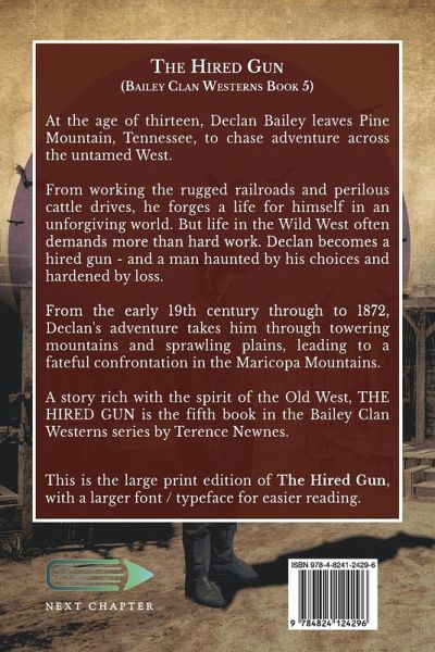 At the age of thirteen, Declan Bailey leaves Pine Mountain, Tennessee, to chase adventure across the untamed West. From working the rugged railroads and perilous cattle drives, he forges a life for himself in an unforgiving world. But life in the Wild West often demands more than hard work. Declan becomes a hired gun - and a man haunted by his choices and hardened by loss. From the early 19th century through to 1872, Declan's adventure takes him through towering mountains and sprawling plains, leading to a fateful confrontation in the Maricopa Mountains. A story rich with the spirit of the Old West, THE HIRED GUN is the fifth book in the Bailey Clan Westerns series by Terence Newnes. This is the large print edition of The Hired Gun, with a larger font / typeface for easier reading.