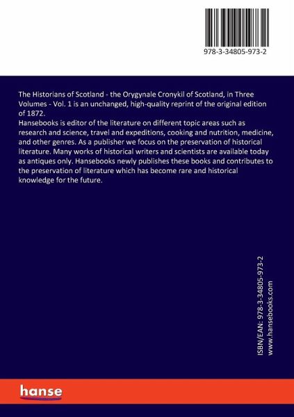 The Historians of Scotland - the Orygynale Cronykil of Scotland, in Three Volumes - Vol. 1 is an unchanged, high-quality reprint of the original edition of 1872.Hansebooks is editor of the literature on different topic areas such as research and science, travel and expeditions, cooking and nutrition, medicine, and other genres. As a publisher we focus on the preservation of historical literature. Many works of historical writers and scientists are available today as antiques only. Hansebooks newly publishes these books and contributes to the preservation of literature which has become rare and historical knowledge for the future.
