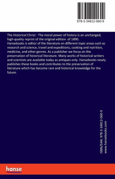 The Historical Christ - The moral power of history is an unchanged, high-quality reprint of the original edition of 1890.Hansebooks is editor of the literature on different topic areas such as research and science, travel and expeditions, cooking and nutrition, medicine, and other genres. As a publisher we focus on the preservation of historical literature. Many works of historical writers and scientists are available today as antiques only. Hansebooks newly publishes these books and contributes to the preservation of literature which has become rare and historical knowledge for the future.