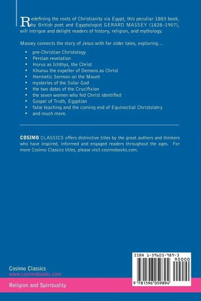 Redefining the roots of Christianity via Egypt, this peculiar book, by British poet and Egyptologist GERARD MASSEY (1828-1907), will intrigue and delight readers of history, religion, and mythology. Massey connects the story of Jesus with far older tales, exploring. . pre-Christian Christology . Persian revelation . Horus as Ichthys, the Christ . Khunsu the expeller of Demons as Christ . Hermetic Sermon on the Mount . mysteries of the Solar God . the two dates of the Crucifixion . the seven women who fed Christ identified . Gospel of Truth, Egyptian . false teaching and the coming end of Equinoctial Christolatry . and much more.