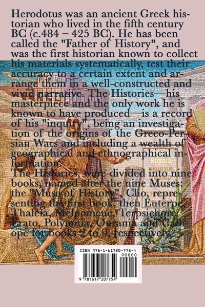 Herodotus was an ancient Greek historian who lived in the fifth century BC (c.484 - 425 BC). He has been called the "Father of History", and was the first historian known to collect his materials systematically, test their accuracy to a certain extent and arrange them in a well-constructed and vivid narrative. The Histories-his masterpiece and the only work he is known to have produced-is a record of his "inquiry", being an investigation of the origins of the Greco-Persian Wars and including a wealth of geographical and ethnographical information. The Histories, were divided into nine books, named after the nine Muses: the "Muse of History", Clio, representing the first book, then Euterpe, Thaleia, Melpomene, Terpsichore, Erato, Polymnia, Ourania and Calliope for books 2 to 9, respectively.