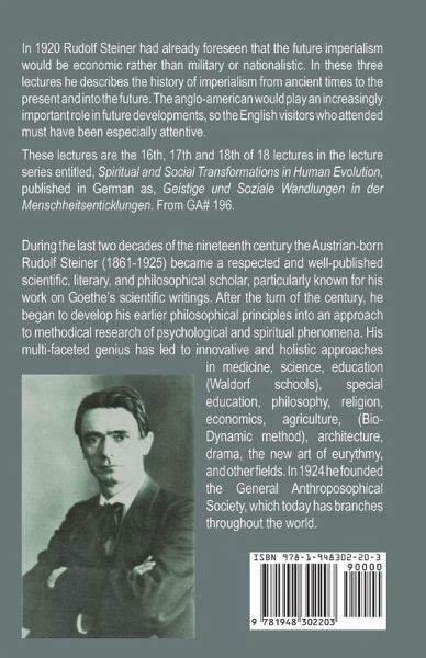 In 1920 Rudolf Steiner had already foreseen that the future imperialism would be economic rather than military or nationalistic. In these three lectures he describes the history of imperialism from ancient times to the present and into the future. The anglo-american would play an increasingly important role in future developments, so the English visitors who attended must have been especially attentive. These lectures are the 16th, 17th and 18th of 18 lectures in the lecture series entitled, Spiritual and Social Transformations in Human Evolution, published in German as, Geistige und Soziale Wandlungen in der Menschheitsenticklungen. They were given by Rudolf Steiner on February 20-22 1920, at Dornach, Switzerland. From Gasumptausgabe (collected works) #196.
