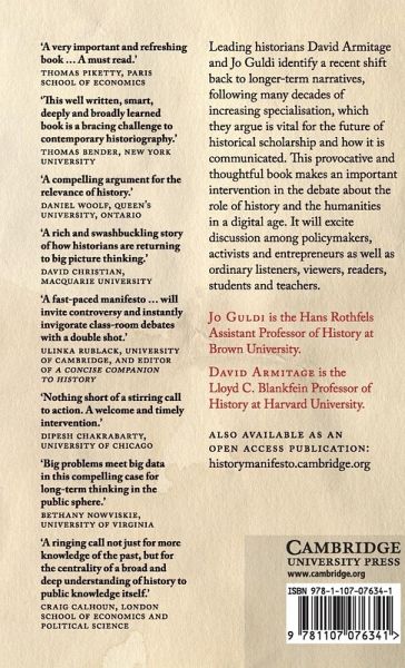 How should historians speak truth to power - and why does it matter? Why is five hundred years better than five months or five years as a planning horizon? And why is history - especially long-term history - so essential to understanding the multiple pasts which gave rise to our conflicted present? The History Manifesto is a call to arms to historians and everyone interested in the role of history in contemporary society. Leading historians Jo Guldi and David Armitage identify a recent shift back to longer-term narratives, following many decades of increasing specialisation, which they argue is vital for the future of historical scholarship and how it is communicated. This provocative and thoughtful book makes an important intervention in the debate about the role of history and the humanities in a digital age. It will provoke discussion among policymakers, activists and entrepreneurs as well as ordinary listeners, viewers, readers, students and teachers. This title is also available as Open Access.