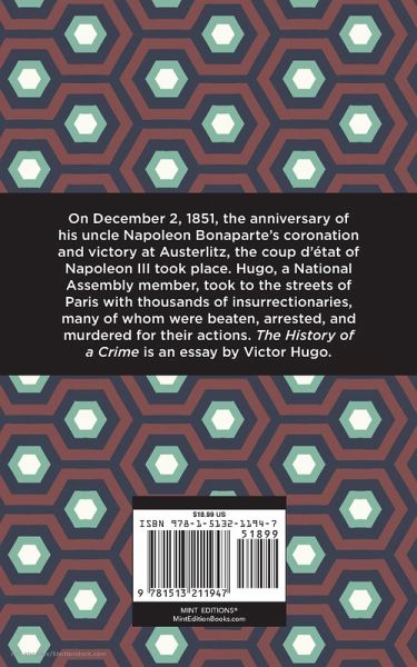 The History of a Crime (1877) is a book-length essay by Victor Hugo. While Hugo is famous today for his status as a leading French poet and novelist of the nineteenth century, he was also a gifted historian and memoirist who served on the National Assembly of the Second Republic. Following the coup d'état of Napoleon III in 1851, Hugo was among the insurrectionists who revolted against military forces on the streets of Paris. Despite their efforts, the coup was successful, leading to Hugo's exile until 1870. "To outrage Right, to suppress the Assembly, to abolish the Constitution, to strangle the Republic, to overthrow the Nation, to sully the Flag, to dishonor the Army, to suborn the Clergy and the Magistracy, to succeed, to triumph, to govern, to administer, to exile, to banish, to transport, to ruin, to assassinate, to reign, with such complicities that the law at last resembles a foul bed of corruption. What! All these enormities were to be committed! And by whom?" The French Second Republic was already in danger when Napoleon III was elected President of France in 1848. A populist, he was in constant conflict with the National Assembly and, nearing the end of his term, sought to seek reelection through constitutional change. When this avenue was denied, he began preparations for Operation Rubicon, a secret plan to conduct a coup d'état with the help of the Army and other high-ranking officials. On December 2nd, 1851, the anniversary of his uncle Napoleon Bonaparte's coronation and victory at Austerlitz, the coup took place. Hugo, a National Assembly member, took to the streets of Paris with thousands of his fellow insurrectionaries, many of whom were beaten, arrested, and murdered for their actions. Despite their efforts, the coup was successful, leading to the reestablishment of the French Empire in 1852. Hugo's essay-part history, part memoir-is a brilliant retelling of one of democracy's darkest moments. Since our inception in 2020, Mint Editions has kept sustainability and innovation at the forefront of our mission. Each and every Mint Edition title gets a fresh, professionally typeset manuscript and a dazzling new cover, all while maintaining the integrity of the original book. With thousands of titles in our collection, we aim to spotlight diverse public domain works to help them find modern audiences. Mint Editions celebrates a breadth of literary works, curated from both canonical and overlooked classics from writers around the globe.