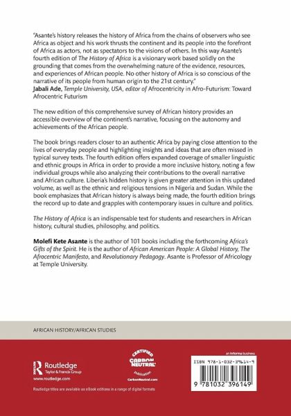 The History of Africa written by the most prolific African American scholar is already one of the most classic books ever written on African history. It is praised by scholars who have studied Africa for decades as well as those who are newcomers to the field. Asante's history releases the history of Africa from the chains of observers who see Africa as object and his work thrusts the continent and its people into the forefront of Africa as actors, not as spectators to the visions of others. In this way Asante's fourth edition of The History of Africa is a visionary work based solidly on the grounding that comes from the overwhelming nature of the evidence, resources, and experiences of African people. No other history of Africa is so conscious of the narrative of its people from human origin to the 21st century."