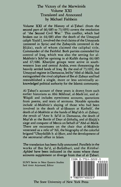 Volume XXI of the History of al-¿abar¿ (from the second part of 66/685 to 73/693) covers the resolution of "the Second Civil War." This conflict, which has broken out in 64/683 after the death of the Umayyad caliph Yaz¿d I, involved the rival claims of the Umayyads (centered in Syria) and the Zubayrids (centered in the Hijaz), each of whom claimed the caliphal title, Commander of the Faithful. Both parties contented for control of Iraq, which was also the setting for al-Mukht¿r's Sh¿¿ite uprising in al-K¿fah during 66/685 and 67/686. Kh¿rijite groups were active in south-western Iran and central Arabia, even threatening the heavily settled lands of Iraq. By the end of 73/692, the Umayyad regime in Damascus, led by Abd-al-Malik, had extinguished the rival caliphate of Ibn al-Zubayr and had reestablished a single, more or less universally acknowledged political authority for the Islamic community. Al-¿abar¿'s account of these years is drawn from such earlier historians as Abu Mikhnaf, al-Mad¿¿in¿, and al-Waqidi and includes eyewitness accounts, quotations from poems, and texts of sermons. Notable episodes include al-Mukht¿r's slaying of those who had been involved in the death of al-Husayn at Karbala, the death of al-Mukht¿r at the hands of Mu¿¿ab ibn al-Zubayr, the revolt of Amr ibn Sä¿d in Damascus, the death of Mu¿¿ab at the Battle of Dayr al-Jathaliq, and al-Hajjaj's siege and conquest of Mecca on behalf of Abd-al-Malik. There are excursuses on the chair that al-Mukht¿r venerated as a relic of Ali, the biography of the colorful brigand ¿Ubayd All¿h b. al-¿urr, and the development of the secretarial office in Islam. The translation has been fully annotated. Parallels in the works of Ibn Sa'd, al-Baladhuri, and the Kitabal-Aghani have been indicated in the notes where these accounts supplement or diverge from that of al-¿abar¿.