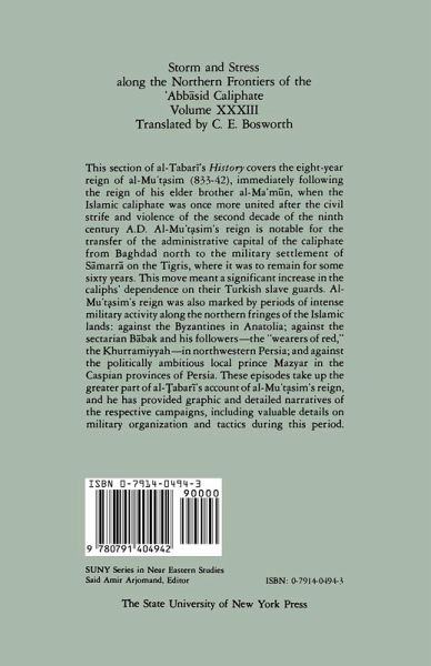 This section of al-¿abar¿'s History covers the eight-year reign of al-Mu¿täim (833-42), immediately following the reign of his elder brother al-Ma'mun, when the Islamic caliphate was once more united after the civil strife and violence of the second decade of the ninth century A.D. Al-Mu'tasim's reign is notable for the transfer of the administrative capital of the caliphate from Baghdad north to the military settlement of Samarra on the Tigris, where it was to remain for some 60 years. This move meant a significant increase in the caliphs' dependence on their Turkish slave guards. Al-Mu¿täim's reign was also marked by periods of intense military activity along the northern fringes of the Islamic lands: against the Byzantines in Anatolia; against the sectarian Babak and his followers--the "wearers of red," the Khurramiyyah--in northwestern Persia; and against the politically ambitious local prince Mazyar in the Caspian provinces of Persia. These episodes take up the greater part of al-Tabari's account of al-Mu¿täim's reign, and he has provided graphic and detailed narratives of the respective campaigns, including valuable details on military organization and tactics during this period.