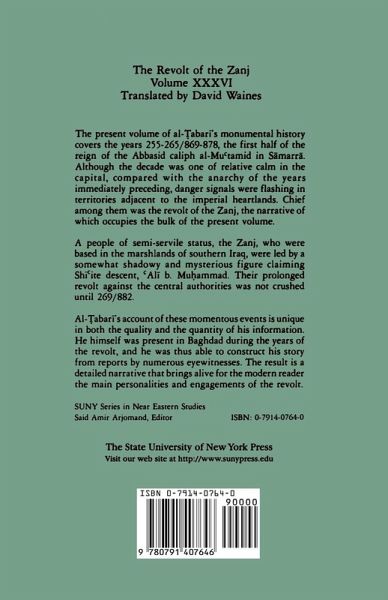 The present volume of al-¿abar¿'s monumental history covers the years 255-265/869-878, the first half of the reign of the Abbasid caliph al-Mütamid in S¿marr¿. Although the decade was one of relative calm in the capital, compared with the anarchy of the years immediately preceding, danger signals were flashing in territories adjacent to the imperial heartlands. Chief among them was the revolt of the Zanj, the narrative of which occupies the bulk of the present volume. A people of semi-servile status, the Zanj, who were based in the marshlands of southern Iraq, were led by a somewhat shadowy and mysterious figure claiming Shi'ite descent, 'Ali b. Muhammad. Their prolonged revolt against the central authorities was not crushed until 269/882. Al-¿abar¿'s account of these momentous events is unique in both the quality and the quantity of his information. He himself was present in Baghdad during the years of the revolt, and he was thus able to construct his story from reports by numerous eyewitnesses. The result is a detailed narrative that brings alive for the modern reader the main personalities and engagements of the revolt.