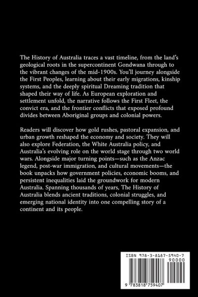 The History of Australia traces a vast timeline, from the land's geological roots in the supercontinent Gondwana through to the vibrant changes of the mid-1900s. You'll journey alongside the First Peoples, learning about their early migrations, kinship systems, and the deeply spiritual Dreaming tradition that shaped their way of life. As European exploration and settlement unfold, the narrative follows the First Fleet, the convict era, and the frontier conflicts that exposed profound divides between Aboriginal groups and colonial powers.Readers will discover how gold rushes, pastoral expansion, and urban growth reshaped the economy and society. They will also explore Federation, the White Australia policy, and Australia's evolving role on the world stage through two world wars. Alongside major turning points-such as the Anzac legend, post-war immigration, and cultural movements-the book unpacks how government policies, economic booms, and persistent inequalities laid the groundwork for modern Australia. Spanning thousands of years, The History of Australia blends ancient traditions, colonial struggles, and emerging national identity into one compelling story of a continent and its people.
