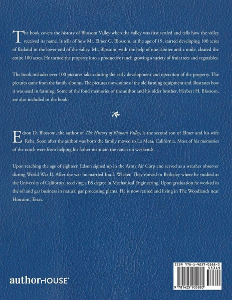 The book covers the history of Blossom Valley when the valley was first settled and tells how the valley received its name. It tells of how Mr. Elmer G. Blossom, at the age of 19, started developing 100 acres of flatland in the lower end of the valley. Mr. Blossom, with the help of one laborer and a mule, cleared the entire 100 acres. He turned the property into a productive ranch growing a variety of fruit trees and vegetables. The book includes over 100 pictures taken during the early development and operation of the property. The pictures came from the family albums. The pictures show some of the old farming equipment and illustrates how it was used in farming. Some of the fond memories of the author and his older brother, Herbert H. Blossom, are also included in the book.