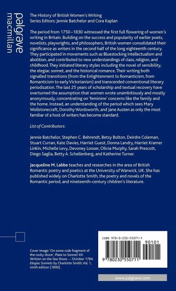List of Figures Author Preface Series Preface Acknowledgements Notes on Contributors Chronology Introduction: Defining 'Women's Writing'; or, Writing 'The History'; J.M.Labbe PART I: 1750-1830: OVERVIEWS Women and Print Culture, 1750-1830; M.Levy Women's Travel Writing, 1750-1830; K.Turner PART II: 1750-1800: REVOLUTIONS IN FEMALE WRITING Bluestocking Women and the Negotiations of Oral, Manuscript and Print Cultures; B.A.Schellenberg '[T]o strike a little out of a road already so much beaten': Gender, Genre and the Mid-Century Novel; J.Batchelor Anglophone Welsh Women's Poetry 1750-1784: Jane Cave and Anne Penny; S.Prescott The Poem That Ate America: Helen Maria Williams' Ode on the Peace (1783); K.Davies Picturing Benevolence Against the Commercial Cry, 1750-1798: or, Sarah Fielding and the Secret Causes of Romanticism; D.Landry Women Writers and Abolition; D . Coleman Charlotte Smith, Mary Wollstonecraft, and the Romance of Real Life; S.Curran Charlotte Smith, Mary Robinson, and the First Year of War with France; H.Guest PART III: 1800-1830: WORLDS OF WRITING The Porter Sisters, Women's Writing, and Historical Fiction; D.Looser Joanna Baillie's Emblematic Theatre; B.Bolton National Internationalism: Women's Writings and European Literature, 1800-1830; D.Saglia Jane Austen's Critical Response to Women's Writing: 'a good spot for fault-finding'; O.Murphy Mary Tighe and the Coterie of British Women Poets in Psyche; H.K.Linkin Influence, Anxiety, and Erasure in Women's Writing: Romantic Becomes Victorian; S.C. Behrendt Bibliography Index