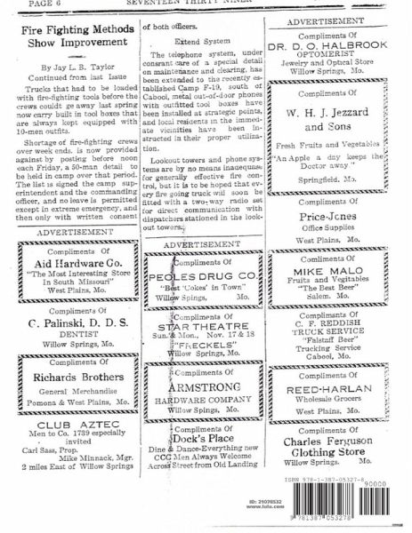 This book contains the history of the Civilian Conservation Corps (CCC) in the Willow Springs area including major projects such as the construction of Noblett Lake and Bluebuck Fire tower. The book contains full historic images of both under construction and many other photos of the CCC camp and other projects. The book contains a timeline of events and lots of other very interesting information about the CCC in our home state!