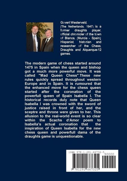 The modern game of chess started around 1475 in Spain when the queen and bishop got a much more powerful move. It was called "Mad Queen Chess". These new rules quickly spread throughout western Europe and in Spain. The enhanced move for the chess queen started after the coronation of the powerfull queen of Spain Isabella I. The historical records duly note that Queen Isabella I was crowned with the sword of justice raised in front of her, and the sceptre and throne were given to her. This allusion to the real-world event is so clear within the Scachs d'Amor poem to Isabella's actual coronation that the inspiration of Queen Isabella for the new chess queen and powerfull dama of the draughts game is unquestionable. The Spaniards like the Moors, played a game on the board of lines and called it alquerque. The game became modern draughts through being transferred to the chessboard around that time. This book is the result of at least 30 years investigations in the Spanish archives