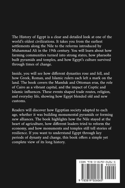 The History of Egypt is a clear and detailed look at one of the world's oldest civilizations. It takes you from the earliest settlements along the Nile to the reforms introduced by Muhammad Ali in the 19th century. You will learn about how farming communities turned into strong states, how pharaohs built pyramids and temples, and how Egypt's culture survived through times of change.Inside, you will see how different dynasties rose and fell, and how Greek, Roman, and Islamic rulers each left a mark on the land. The book covers the Mamluk and Ottoman eras, the role of Cairo as a vibrant capital, and the impact of Coptic and Islamic influences. These events shaped trade routes, religion, and everyday life, showing how Egypt blended old and new customs.Readers will discover how Egyptian society adapted to each age, whether it was building monumental pyramids or forming new alliances. The book highlights how the Nile stayed at the heart of agriculture, how different leaders tried to reform the economy, and how monuments and temples still tell stories of resilience. If you want to understand Egypt through key periods of dynasty and change, this book offers a simple yet complete view of its long history.
