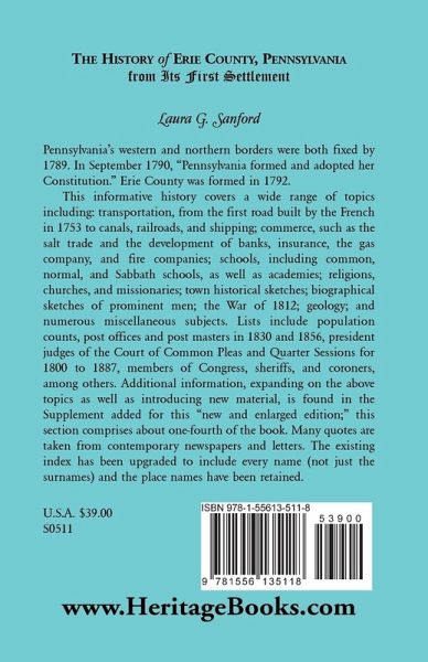 Pennsylvania's western and northern borders were both fixed by 1789. In September 1790, "Pennsylvania formed and adopted her Constitution." Erie County was formed in 1792. This informative history covers a wide range of topics including: transportation, from the first road built by the French in 1753 to canals, railroads, and shipping; commerce, such as the salt trade and the development of banks, insurance, the gas company, and fire companies; schools, including common, normal, and Sabbath schools, as well as academies; religions, churches, and missionaries; town historical sketches; biographical sketches of prominent men; the War of 1812; geology; and numerous miscellaneous subjects. Lists include population counts, post offices and post masters in 1830 and 1856, president judges of the Court of Common Pleas and Quarter Sessions for 1800 to 1887, members of Congress, sheriffs, and coroners, among others. Additional information, expanding on the above topics as well as introducing new material, is found in the Supplement added for this "new and enlarged edition;" this section comprises about one-fourth of the book. Many quotes are taken from contemporary newspapers and letters. The existing index has been upgraded to include every name (not just the surnames) and the place names have been retained.