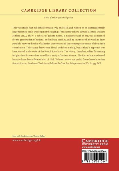 This vast study, first published between 1784 and 1818, and written on an unprecedentedly large historical scale, was begun at the urging of the author's friend Edward Gibbon. William Mitford (1744-1827), a scholar of private means, a magistrate and an MP, was concerned for the preservation of national and military stability, and he in part used his work to draw parallels between the rise of Athenian democracy and the contemporary status of the British constitution. This stance drew some criticism initially, but Mitford's approach was later praised in the wake of the French Revolution. The History, therefore, offers fascinating insights into its own time as well as a study of ancient Greece. The four volumes reissued here are from the uniform edition of 1808. Volume 1 covers the period from Greece's earliest foundations to the time of Pericles and the end of the first Peloponnesian War in 445 BCE.