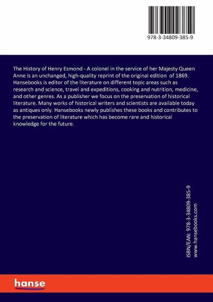 The History of Henry Esmond - A colonel in the service of her Majesty Queen Anne is an unchanged, high-quality reprint of the original edition of 1869.Hansebooks is editor of the literature on different topic areas such as research and science, travel and expeditions, cooking and nutrition, medicine, and other genres. As a publisher we focus on the preservation of historical literature. Many works of historical writers and scientists are available today as antiques only. Hansebooks newly publishes these books and contributes to the preservation of literature which has become rare and historical knowledge for the future.