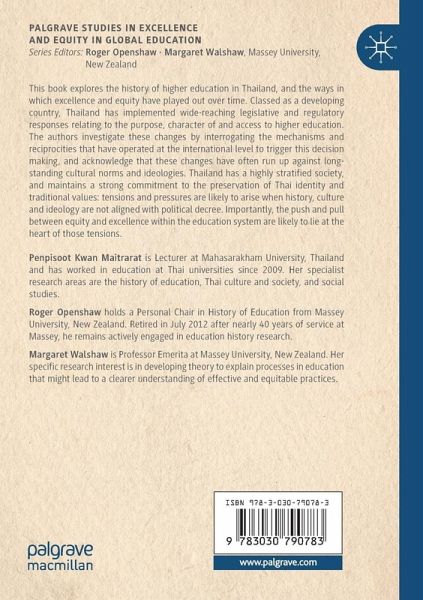 This book explores the history of higher education in Thailand, and the ways in which excellence and equity have played out over time. Classed as a developing country, Thailand has implemented wide-reaching legislative and regulatory responses relating to the purpose, character of and access to higher education. The authors investigate these changes by interrogating the mechanisms and reciprocities that have operated at the international level to trigger this decision making, and acknowledge that these changes have often run up against long-standing cultural norms and ideologies. Thailand has a highly stratified society, and maintains a strong commitment to the preservation of Thai identity and traditional values: tensions and pressures are likely to arise when history, culture and ideology are not aligned with political decree. Importantly, the push and pull between equity and excellence within the education system are likely to lie at the heart of those tensions.
