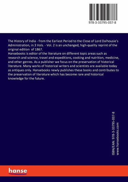 The History of India - from the Earliest Period to the Close of Lord Dalhousie's Administration, in 3 Vols. - Vol. 2 is an unchanged, high-quality reprint of the original edition of 1867. Hansebooks is editor of the literature on different topic areas such as research and science, travel and expeditions, cooking and nutrition, medicine, and other genres. As a publisher we focus on the preservation of historical literature. Many works of historical writers and scientists are available today as antiques only. Hansebooks newly publishes these books and contributes to the preservation of literature which has become rare and historical knowledge for the future.