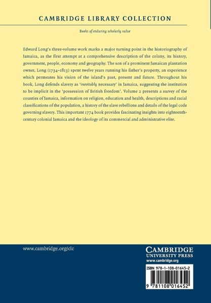 Edward Long's three-volume work marks a major turning point in the historiography of Jamaica, as the first attempt at a comprehensive description of the colony, its history, government, people, economy and geography. The son of a prominent Jamaican plantation owner, Long (1734-1813) spent twelve years running his father's property, an experience which permeates his vision of the island's past, present and future. Throughout his book, Long defends slavery as 'inevitably necessary' in Jamaica, suggesting the institution to be implicit in the 'possession of British freedom'. Volume 2 presents a survey of the counties of Jamaica, information on religion, education and health, descriptions and racial classifications of the population, a history of the slave rebellions and details of the legal code governing slavery. This important 1774 book provides fascinating insights into eighteenth-century colonial Jamaica and the ideology of its commercial and administrative elite.