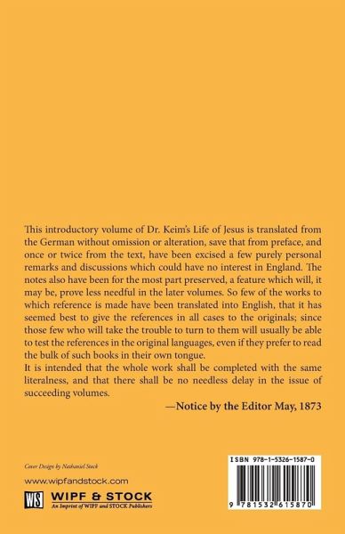 This introductory volume of Dr. Keim's Life of Jesus is translated from the German without omission or alteration, save that from preface, and once or twice from the text, have been excised a few purely personal remarks and discussions which could have no interest in England. The notes also have been for the most part preserved, a feature which will, it may be, prove less needful in the later volumes. So few of the works to which reference is made have been translated into English, that it has seemed best to give the references in all cases to the originals; since those few who will take the trouble to turn to them will usually be able to test the references in the original languages, even if they prefer to read the bulk of such books in their own tongue. It is intended that the whole work shall be completed with the same literalness, and that there shall be no needless delay in the issue of succeeding volumes. --Notice by the Editor May, 1873