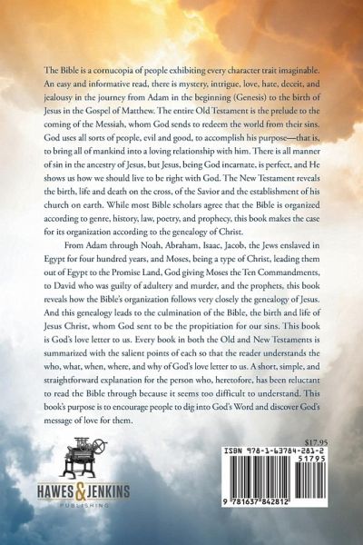 The Bible is a cornucopia of people exhibiting every character trait imaginable. An easy and informative read, there is mystery, intrigue, love, hate, deceit, and jealousy in the journey from Adam in the beginning (Genesis) to the birth of Jesus in the Gospel of Matthew. The entire Old Testament is the prelude to the coming of the Messiah, whom God sends to redeem the world from their sins. God uses all sorts of people, evil and good, to accomplish his purpose--that is, to bring all of mankind into a loving relationship with him. There is all manner of sin in the ancestry of Jesus, but Jesus, being God incarnate, is perfect, and He shows us how we should live to be right with God. The New Testament reveals the birth, life and death on the cross, of the Savior and the establishment of his church on earth. While most Bible scholars agree that the Bible is organized according to genre, history, law, poetry, and prophecy, this book makes the case for its organization according to the genealogy of Christ. From Adam through Noah, Abraham, Isaac, Jacob, the Jews enslaved in Egypt for four hundred years, and Moses, being a type of Christ, leading them out of Egypt to the Promise Land, God giving Moses the Ten Commandments, to David who was guilty of adultery and murder, and the prophets, this book reveals how the Bible's organization follows very closely the genealogy of Jesus. And this genealogy leads to the culmination of the Bible, the birth and life of Jesus Christ, whom God sent to be the propitiation for our sins. This book is God's love letter to us. Every book in both the Old and New Testaments is summarized with the salient points of each so that the reader understands the who, what, when, where, and why of God's love letter to us. A short, simple, and straightforward explanation for the person who, heretofore, has been reluctant to read the Bible through because it seems too difficult to understand. This book's purpose is to encourage people to dig into God's Word and discover God's message of love for them. 2