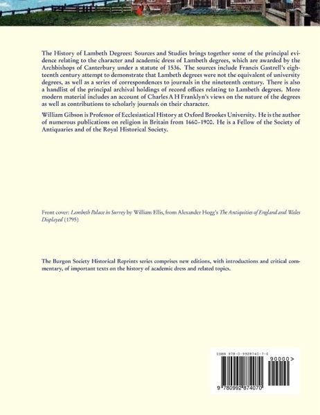 The History of Lambeth Degrees: Sources and Studies brings together some of the principal evidence relating to the character and academic dress of Lambeth degrees, which are awarded by the Archbishops of Canterbury under a statute of 1536. The sources include Francis Gastrell’s eigh teenth century attempt to demonstrate that Lambeth degrees were not the equivalent of university degrees, as well as a series of correspondences to journals in the nineteenth century. There is also a handlist of the principal archival holdings of record offices relating to Lambeth degrees. More modern material includes an account of Charles A H Franklyn’s views on the nature of the degrees as well as contributions to scholarly journals on their character.