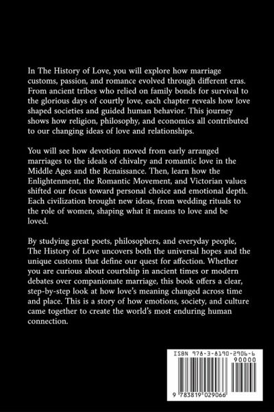 In The History of Love, you will explore how marriage customs, passion, and romance evolved through different eras. From ancient tribes who relied on family bonds for survival to the glorious days of courtly love, each chapter reveals how love shaped societies and guided human behavior. This journey shows how religion, philosophy, and economics all contributed to our changing ideas of love and relationships.You will see how devotion moved from early arranged marriages to the ideals of chivalry and romantic love in the Middle Ages and the Renaissance. Then, learn how the Enlightenment, the Romantic Movement, and Victorian values shifted our focus toward personal choice and emotional depth. Each civilization brought new ideas, from wedding rituals to the role of women, shaping what it means to love and be loved.By studying great poets, philosophers, and everyday people, The History of Love uncovers both the universal hopes and the unique customs that define our quest for affection.Whether you are curious about courtship in ancient times or modern debates over companionate marriage, this book offers a clear, step-by-step look at how love's meaning changed across time and place. This is a story of how emotions, society, and culture came together to create the world's most enduring human connection.