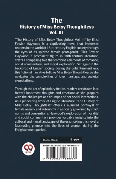 "The History of Miss Betsy Thoughtless Vol. III" by Eliza Fowler Haywood is a captivating novel that immerses readers in the world of 18th-century English society through the eyes of its spirited female protagonist. Eliza Fowler Haywood, a prominent figure in 18th-century literature, crafts a compelling tale that combines elements of romance, social commentary, and moral exploration. Set against the backdrop of English society during the Enlightenment era, this fictional narrative follows Miss Betsy Thoughtless as she navigates the complexities of love, marriage, and societal expectations. Through the art of epistolary fiction, readers are drawn into Betsy's innermost thoughts and emotions as she grapples with the challenges and triumphs of her social interactions. As a pioneering work of English literature, "The History of Miss Betsy Thoughtless" offers a nuanced portrayal of female agency and autonomy in a society governed by strict norms and conventions. Haywood's exploration of morality and social commentary provides valuable insights into the cultural and moral landscape of the era, making this novel a fascinating glimpse into the lives of women during the Enlightenment period.
