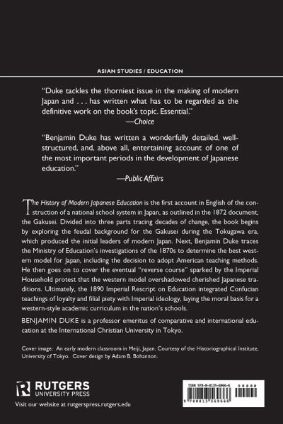 Introduction: The Aims of Education for Modern Japan Part I: The Feudal Foundation of Modern Japanese Education Education of the Samurai in Tokugawa Schools: Nisshinkan Education of the Samurai in the West: London University and Rutgers College, 1863-1868 The Meiji Restoration: Reemergence of Tokugawa Schools, 1868-1871 Part II: The First Decade of Modern Education, 1870s: The American Model The Gakusei: The First National Plan for Education, 1872 The Iwakura Mission: A Survey of Western Education, 1872-1873 The Modern Education of Japanese Girls: Georgetown, Bryn Mawr, Vassar, 1872 The Modern Japanese Teacher: The San Francisco Method, 1872-1873 Implementing the First National Plan for Education: The American Model, Phase I, 1873-1876 Rural Resistance to Modern Education: The Japanese Peasant, 1873-1876 The Imperial University of Engineering: The Scottish Model, 1873-1882 Pestalozzi to Japan: Switzerland to New York to Tokyo, 1875-1878 Scientific Agriculture and Puritan Christianity on the Japanese Frontier: The Massachusetts Model, 1876-1877 The Philadelphia Centennial: The American Model Revisited, 1876 The Second National Plan for Education: The American Model, Phase II, 1877-1879 Part III: The Second Decade of Modern Education, 1880s: Reaction against the Western Model The Imperial Will on Education: Moral versus Science Education, 1879-1880 The Third National Plan for Education: The Reverse Course, 1880-1885 Education for the State: The German Model, 1886-1889 The Imperial Rescript on Education: Western Science and Eastern Morality for the Twentieth Century, 1890