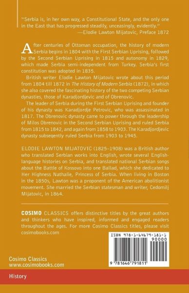 "Serbia is, in her own way, a Constitutional State, and the only one in the East that has progressed steadily, unceasingly, evidently." -Elodie Lawton Mijatovi¿, Preface 1872 After centuries of Ottoman occupation, the history of modern Serbia begins in 1804 with the First Serbian Uprising, followed by the Second Serbian Uprising in 1815 and autonomy in 1829, which made Serbia semi-independent from Turkey. Serbia's first constitution was adopted in 1835. British writer Elodie Lawton Mijatovic wrote about this period from 1804 till 1872 in The History of Modern Serbia (1872), in which she also covered the fascinating history of the two competing Serbian dynasties, those of Karadjordjevi¿ and of Obrenovi¿. The leader of Serbia during the First Serbian Uprising and founder of his dynasty was Karadjordje Petrovi¿, who was assassinated in 1817. The Obrenovi¿ dynasty came to power through the leadership of Milos Obrenovi¿ in the Second Serbian Uprising and ruled Serbia from 1815 to 1842, and again from 1858 to 1903. The Karadjordjevic dynasty subseqently ruled Serbia from 1903 to 1945.