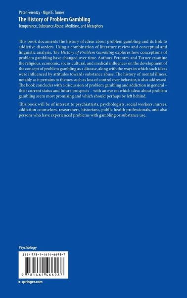 In this remarkable, erudite, and well written book, Peter Ferentzy and Nigel E. Turner perform -- for the first time -- a historical analysis of the idea of "problem gambling," more recently gambling addiction. . . . Modern medical models often overestimate the compulsivity and irreversibility of both substance and behavioral addictions [but] after accompanying Ferentzy and Turner on their survey, readers will realize it is impossible to comprehend the modern psychiatric classification of addictions without making this journey along with them. -Stanton Peele, Ph.D., author of 7 Tools to Beat Addiction; creator of the Life Process Program for addiction treatment