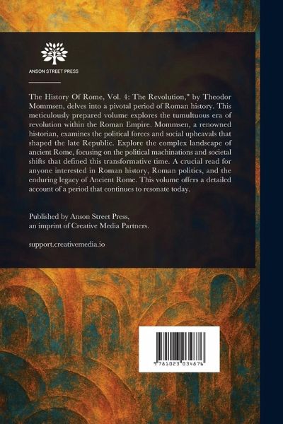 The History Of Rome, Vol. 4: The Revolution," by Theodor Mommsen, delves into a pivotal period of Roman history. This meticulously prepared volume explores the tumultuous era of revolution within the Roman Empire. Mommsen, a renowned historian, examines the political forces and social upheavals that shaped the late Republic. Explore the complex landscape of ancient Rome, focusing on the political machinations and societal shifts that defined this transformative time. A crucial read for anyone interested in Roman history, Roman politics, and the enduring legacy of Ancient Rome. This volume offers a detailed account of a period that continues to resonate today. This work has been selected by scholars as being culturally important, and is part of the knowledge base of civilization as we know it. This work is in the public domain in the United States of America, and possibly other nations. Within the United States, you may freely copy and distribute this work, as no entity (individual or corporate) has a copyright on the body of the work. Scholars believe, and we concur, that this work is important enough to be preserved, reproduced, and made generally available to the public. We appreciate your support of the preservation process, and thank you for being an important part of keeping this knowledge alive and relevant.