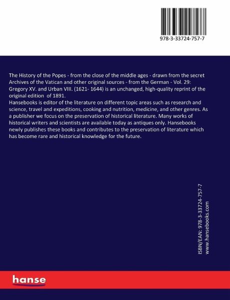 The History of the Popes - from the close of the middle ages - drawn from the secret Archives of the Vatican and other original sources - from the German - Vol. 29: Gregory XV. and Urban VIII. (1621- 1644) is an unchanged, high-quality reprint of the original edition of 1891.Hansebooks is editor of the literature on different topic areas such as research and science, travel and expeditions, cooking and nutrition, medicine, and other genres. As a publisher we focus on the preservation of historical literature. Many works of historical writers and scientists are available today as antiques only. Hansebooks newly publishes these books and contributes to the preservation of literature which has become rare and historical knowledge for the future.