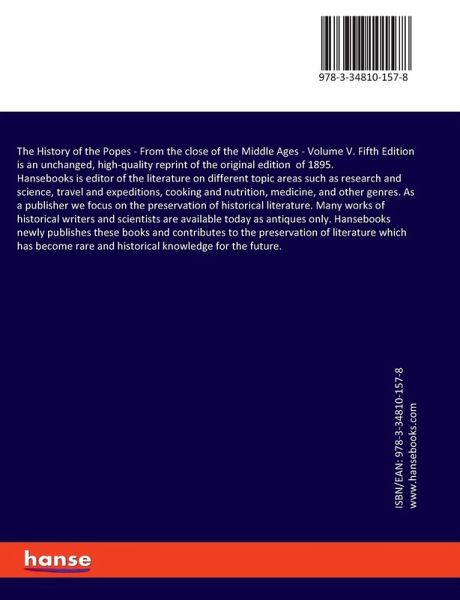 The History of the Popes - From the close of the Middle Ages - Volume V. Fifth Edition is an unchanged, high-quality reprint of the original edition of 1895.Hansebooks is editor of the literature on different topic areas such as research and science, travel and expeditions, cooking and nutrition, medicine, and other genres. As a publisher we focus on the preservation of historical literature. Many works of historical writers and scientists are available today as antiques only. Hansebooks newly publishes these books and contributes to the preservation of literature which has become rare and historical knowledge for the future.