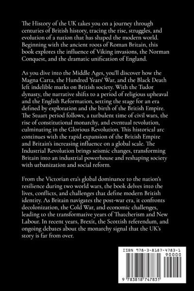 The History of the UK takes you on a journey through centuries of British history, tracing the rise, struggles, and evolution of a nation that has shaped the modern world. Beginning with the ancient roots of Roman Britain, this book explores the influence of Viking invasions, the Norman Conquest, and the dramatic unification of England. As you dive into the Middle Ages, you'll discover how the Magna Carta, the Hundred Years' War, and the Black Death left indelible marks on British society.With the Tudor dynasty, the narrative shifts to a period of religious upheaval and the English Reformation, setting the stage for an era defined by exploration and the birth of the British Empire. The Stuart period follows, a turbulent time of civil wars, the rise of constitutional monarchy, and eventual revolution, culminating in the Glorious Revolution. This historical arc continues with the rapid expansion of the British Empire and Britain's increasing influence on a global scale.The Industrial Revolution brings seismic changes, transforming Britain into an industrial powerhouse and reshaping society with urbanization and social reform. From the Victorian era's global dominance to the nation's resilience during two world wars, the book delves into the lives, conflicts, and challenges that define modern British identity. As Britain navigates the post-war era, it confronts decolonization, the Cold War, and economic challenges, leading to the transformative years of Thatcherism and New Labour.In recent years, Brexit, the Scottish referendum, and ongoing debates about the monarchy signal that the UK's story is far from over. The History of the UK examines how these recent events echo the nation's past and shape its future. This book captures the spirit of a nation that has weathered invasion, revolution, and reinvention, offering readers an in-depth look at the complex tapestry of British history and the enduring impact of the UK on the world stage.