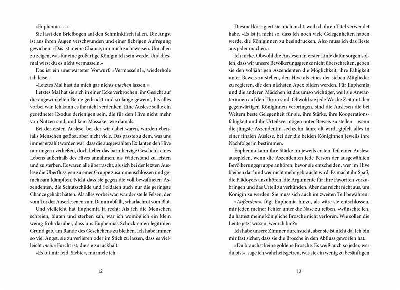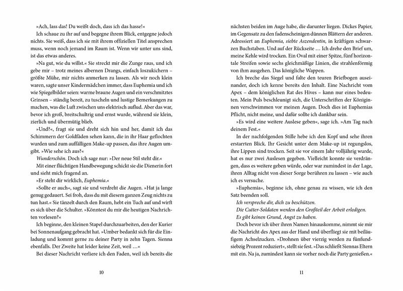 Der Einstieg ist ein wenig schwergängig. Unwissend landet der Leser im Geschehen und wird mit diversen Vorgängen und Namen konfrontiert, die er nicht zuordnen kann, obwohl der Aufbau der königlichen Familie beigefügt ist. Erst im weiteren Verlauf wird langsam klar, wie die Abläufe im Hive funktionieren. Das heißt, diese Lektüre fordert schon die gesamte Aufmerksamkeit, damit man folgen kann. Sie ist nichts für nebenbei. Das ist allerdings auch kein Problem. Ich mag es, meine Konzentration komplett auf eine Sache zu zentrieren. Erschwert wird das Ganze durch die Hauptprotagonistin, aus deren Sicht man durch die Handlung geführt wird. Arenite wurde derart konditioniert, dass sie keine eigene Meinung mehr hat, denn sie steht ihr schlicht nicht zu. Damit kann man sich nur schwer in sie hineinversetzen. Niko ist im Gegensatz deutlich selbstbestimmter und bringt damit Leben in die Geschichte. Und durch ihn verändert sich auch Arenite. Ihre Entwicklung erfolgt nach und nach und wurde schön umgesetzt.