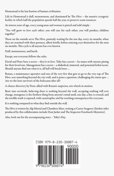 Homestead is the last bastion of human civilisation. Life in Homestead is dull, monotonous, and dominated by The Hive - the massive cryogenic facility in which half the population spends half the year, to preserve scant resources. At sixteen years of age, every young man and woman is paired and told simply - "You will grow to love each other; you will care for each other; you will produce children together." Those on the outside serve The Hive, patiently waiting for the one day, every six months, when they are reunited with their partners, albeit briefly, before entering cryo themselves for the next six months. This cycle is all anyone has ever known. Dull, monotonous, and harsh. Except, not everyone follows the rules. David and Peter have a secret - they're in love. Toby has a secret - he mates with anyone pining for their loved one. Management has a secret - a diabolical, immoral, and potential lethal secret. Should anyone find out what it is, all hell will break loose ... Ronan, a maintenance operative and one of the very few that gets to go to the very top of The Hive, sees something beyond the city wall, and it poses a question, challenging the status quo ... Are we the lone survivors of the holocaust after all? A chance discovery by Peter, allied with Ronan's suspicion, sets wheels in motion. Born into servitude, believing there is nothing beyond the wall, accepting nothing will ever change, insurgence is the furthest thing from anyone's mind until, one day, a line is crossed, and the terrible truth is exposed, with catastrophic and far-reaching consequences for everyone. It is nothing compared to what they find outside the wall. The Hive is written by Alp Mortal and Chambers Mars, writing as Carter Seagrove (further titles produced by this collaboration include Dust Jacket and The Inspector Fenchurch Mysteries). Also, look out for the accompanying story - Toby's Day.