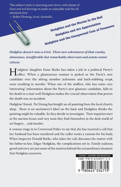 Hodgkiss doesn't miss a trick. Two new adventures of that cranky, obnoxious, insufferable but remarkably observant and astute senior citizen. Hodgkiss' daughter Esme Burke has taken a job in a political Party's office. When a glamourous woman is picked as the Party's new candidate over the sitting member jealousies and back-stabbing erupt, soon resulting in murder. When one of the staffers, who has some very 'interesting' information about the Party's new glamour candidate, falls to his death in a stair well Hodgkiss makes the crucial observation that proves the death was no accident. Hodgkiss' friend, Pat Strong has bought an oil painting from the local charity shop. There is an auctioneer's label on the back and Hodgkiss thinks the painting might be valuable. So they decide to investigate. Their inquiries start at the auction house and very soon they find themselves in the dark world of art forgery ... and murder. A woman rings in to Crestwood Police to say that she has received a call that her husband has been murdered and the caller wants a ransom for his body. When Inspector Donald Burke, who takes the call, discusses the matter with his father-in-law, Edgar Hodgkiss, the complications set in. Family jealousy, greed and envy are just some of the motives behind the extraordinary situation that Hodgkiss uncovers.